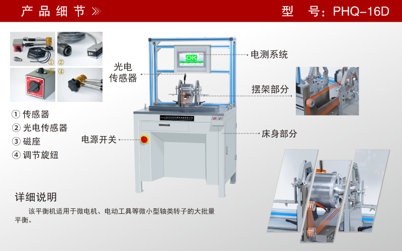 自動(dòng)定位平衡機(jī)適用于微型磁電機(jī)轉(zhuǎn)子等微小型軸類轉(zhuǎn)子的大批量平衡。
